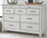 Made with veneers and select hardwood solids in a distressed whitewashed finish. Design features updated traditional styling with generously scaled moulding details. Dresser features 7 full sized drawers with 2 small scaled accessory drawers. Ball bearing side glides. Hardware has a transitional aesthetic and is finished in a dark color. Mansion style headboard options feature a picture framed panel or inset tufted taupe upholstery cushion. Optional storage bench footboard.