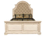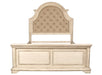 Romance your bedroom with the New Classic Furniture Anastasia Bed, a marvel of real wood construction crafted from solid poplar and oak veneer for unparalleled durability. The heirloom finish, achieved through a meticulous multi-step process involving wire brushing, clefts, rasping, threading, and rub throughs, creates an upscale, vintage look with each piece being one-of-a-kind. The finish, enhanced with brown and gray burnishing, exudes vintage French country cottage charm. Softly arched molding frames the easy-care 100% polyester button-tufted upholstered headboard, creating a welcoming ambiance. This bed goes beyond aesthetics with functional USB charging ports on either side of the headboard, providing a convenient place to charge devices. All furniture complies with safety standards, ensuring your comfort and peace of mind. With a 1-year limited warranty, the Anastasia Bed seamlessly combines timeless design with modern functionality for a secure and stylish addition to your bedroom.