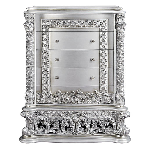 ACMEA luxurious antique silver finish with hand-brushed gold accents makes up the Sandoval chest. Surrounded by fine Rococo scrolls and floral ornament...