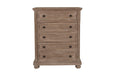 The Allegra 5 Drawer Chest in a sophisticated pale pewter finish is a perfect blend of durability, style, and functional storage, making it a standout addition to any bedroom. Expertly crafted from solid Mindi wood, engineered woods, and wood veneers, this chest combines the natural beauty of Mindi's rich grain with exceptional durability and resistance to decay, ensuring it remains a stunning centerpiece for years to come. The meticulous multi-step finish, enhanced by a delicate brush treatment and subtle white hang-up effect, adds depth and character, making this piece a timeless addition to any space. With a transitional design, the Allegra collection effortlessly blends classic and modern elements, offering a versatile style that complements both traditional and contemporary interiors. Built with heirloom craftsmanship, the chest features four-corner English dovetail joints and smooth-rolling full-extension glides for strength, durability, and easy access. The felt-lined top drawer cradles your most delicate items, while the cedar-lined bottom drawer naturally preserves the freshness of your belongings. These thoughtful touches not only protect but also enhance the luxury of your space, combining practicality with refined style.