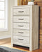 Your bedroom isn’t just a room. It’s a canvas. Express your farmhouse style with this chest of drawers. Wispy white finish over replicated oak wood grain brightens up the space with charm. Brushed nickel-tone handles with black edging finesse the piece with a bit of shine. Drawers are spacious and lined with faux linen laminate to hold your belongings with care. This clean-lined profile is the perfect authentic foundation for inviting decor.