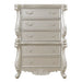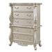Create the bedroom of your dreams with our Bently chest, which includes a magnificent frame that is adorned with stunning floral and scrolled details. This chest features five ample drawers that will make it convenient for you to keep a clutter-free bedroom. The glides ensure that the drawers open and close smoothly. The beautiful, scalloped edges add refinement and visual interest, and the scroll legs are beautiful and sturdy. The champagne finish is rich and sophisticated.