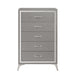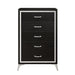 The Huxley 5-Drawer Chest combines contemporary glam with durable construction for a stylish addition to your bedroom. This vertical dresser is crafted from manufactured woods and eco-friendly decorative laminate, ensuring it will stand the test of time. The design features clean lines with metallic accents and flared silver legs, adding a modern touch. Its rich finish provides a sleek, sophisticated look that is both timeless and modern, highlighting the metallic accents and smooth surfaces for a chic and polished aesthetic. The quality drawer construction includes English dovetail joinery and smooth-rolling center glides for long-lasting operation. Functional and fashionable, this chest offers ample storage for clothing, with chic, crystal-studded drawer pulls for easy access.
