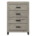 A fresh take on farmhouse design the Mari bedroom collection offers a sleek transitional design aesthetic. The bedroom set is finished in a stylish light gray with black accents that can appease anyone. The bed features a chevron-paneLED headboard and sits on black wooden legs. All the casegoods offer storage drawers with contrasting black metal pulls and sit on black wooden legs to match the bed. The dresser mirror is encased in a wooden frame to match the dresser.