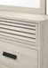 This bedroom collection radiates contemporary charm with its light wood finish and minimalist design. The bed, with its clean lines and louvered headboard, offers a modern twist on a classic design, creating a serene focal point in the room. Complementary pieces include a spacious dresser topped with a large mirror that adds depth and brightness to the space, a tall chest providing ample vertical storage, and a nightstand with convenient bedside access. Each piece is accented with sleek, dark hardware that stands out against the light finish, adding a subtle contrast that is both striking and elegant.