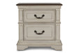 Complete your bedroom ensemble with the New Classic Furniture Anastasia 2 Drawer Nightstand. Crafted with real wood construction from solid poplar and oak veneer, this nightstand ensures long-lasting durability. The heirloom finish, achieved through a multi-step process involving wire brushing, clefts, rasping, threading, and rub throughs, delivers an upscale, vintage look where no two pieces are alike. The creamy off-white stain, enhanced with brown and gray burnishing, exudes vintage French country cottage charm, accentuated by a rustic brown finish top for an antique, old-world appeal. The graceful composition includes picture frame drawer fronts, bracket feet, detailed crown molding aprons, and chamfered panel appliques, adorned with antique gold drop ball drawer pulls. Effortless drawer operation with ball bearing glides ensures smooth and easy access. The nightstand offers clean and carefree storage with sanded and sealed drawers, and the top drawer is lined with felt to protect delicate items. Time-tested quality is evident in the four-corner English dovetail joinery, providing a strong and durable piece of furniture. Rest easy knowing that this nightstand complies with safety standards, offering a secure and stylish addition to your bedroom. With a 1-year limited warranty, it's a practical and charming choice for your nighttime essentials.