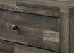 This bedroom collection embodies a rustic, yet minimalist aesthetic with its clean lines and neutral color palette. The set includes a low-profile bed frame, a dresser with a mirror, and a tall chest, all finished that easily complements any decor. The sleek metal handles on the drawers add a touch of contemporary flair, while the large mirror reflects light, making the space feel brighter and more open.