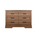 The Coventry Hall Dresser in Pecan combines durability and style, making it a standout piece for any bedroom. Made from high-quality manufactured woods and topped with eco-friendly decorative laminate, this dresser offers a robust and stable storage solution. Its modern rustic design harmoniously blends the warmth and texture of natural wood with clean lines and minimalism, providing a versatile aesthetic that fits various decor styles. The eco-friendly laminate not only mimics the natural look of wood but also resists scratches, stains, and moisture, ensuring lasting beauty and functionality. With features such as clean lines, picture frame moldings, bracket feet, and contrasting hardware, the dresser brings a contemporary touch to any space. The six spacious drawers, constructed with durable dovetail joinery and equipped with ball bearing glides, ensure smooth operation and ample storage for clothing. The Coventry Hall Dresser is a practical and stylish choice for anyone seeking a combination of elegance and functionality in their bedroom furniture.