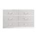The Europa 6 Drawer Dresser in white combines modern elegance with practical functionality. This dresser features a sleek, sophisticated look achieved with a gleaming white finish, mylar accents, and acrylic drawer pulls. Quality craftsmanship is evident in the eco-friendly manufactured woods, assembled with durability in mind, and finished with a glossy white topcoat. Upscale extras include a silver mylar pedestal base that elevates the glamour of this piece. The sturdy, well-constructed drawers feature dovetail joinery and ball bearing glides for a durable, easy-glide operation, with interiors finished for snag-free storage. The six spacious drawers provide ample storage for clothing, making this dresser both a stylish and practical addition to your bedroom. Choose the Europa 6 Drawer Dresser for a blend of contemporary style and high-quality craftsmanship.