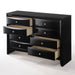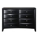 The Ireland I dresser with spacious drawers is sure to provide style and functionality for any bedroom needs. All drawers have English dovetail with center metal glides. The dresser is complemented by slightly flared square legs and a modern black finish with shaped drawer fronts.
