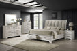This bedroom set offers a sleek and stylish update to any space, featuring a rich, dark finish that commands attention while maintaining a sense of warmth and coziness. The bed stands as the stunning centerpiece, with its high, padded headboard upholstered in a plush fabric that invites relaxation and comfort. Flanking the bed are matching nightstands, providing convenient access to storage and display space. The set is rounded out with a capacious dresser, accented with a broad mirror that adds depth and brightness to the room.