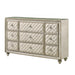 Our luxurious Lucienne dresser is designed to elevate your bedroom to the next level of sophistication and glamour. This stunning dresser is expertly crafted with attention to detail and quality. Upholstered in a luxurious beige velvet fabric, adding a touch of opulence and glamour to the overall design. Featuring quilted drawer fronts with crystal-like knobs. This dresser features nine drawers, offering even more storage space for all your clothing and accessories. The bun legs add a touch of classic elegance, creating a unique and sophisticated look that will enhance any decor.