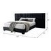 This Rivas bedroom group is sure to make a bold statement in your bedroom. The bed is fully padded in a luxurious black crushed fabric. Create a grand statement with its oversized channel-tufted headboard. This feature adds depth and more texture to the design. Not only is the bed beautiful, but it is also durable and sturdy. The sleek and modern matching case goods offer a touch of glam on their own with the crystal-like inserts that are showcased on the front panels. Providing plenty of storage and jewelry drawers for all your prized possessions. This collection is sure to wow everyone.