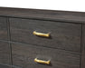 Step into a realm of contemporary sophistication with this bedroom collection. Flaunting a harmonious blend of rich, warm wood tones and bold, metallic accents, each piece exudes a luxe yet inviting appeal. The bed, with its sleek, linear design and striking headboard, becomes the centerpiece, complemented by storage options that blend functionality with chic, clean lines.