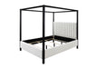 This canopy bed is a modern statement piece, blending the luxurious feel of a traditional four-poster bed with the clean, sleek lines of contemporary design. Its bold, frame creates a striking silhouette against any bedroom backdrop, while the plush, tufted headboard in a cozy boucle upholstery adds a touch of elegance and comfort. The bed's commanding presence is softened by the fabric's texture, inviting a serene and restful sleep.