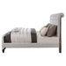 This Andria upholstered bed features an impressive rolled headboard. Generously padded features deep handcrafted buttonless tufting on the headboard to create a luxury decorative classic feeling. The woven upholstery fabric gives the bed a sophisticated finish. Exposed wooden feet and trim are in a reclaimed finish are the perfect finishing touch.