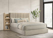 A striking balance of softness and ingenuity, this storage bed is a true centerpiece. A plush, vertical channel-tufted headboard is embraced by light oak bookcase panels, each with three open shelves that glide outward on hidden casters. Wrapped in textured fabric and built with engineered wood and a durable laminate veneer, the supportive platform base offers comfort and stability with a touch of modern grace.