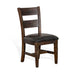 This ladder-back dining chair features a black vinyl cushion seat. Constructed with wire-brushed wooden frame legs and rustic charm, this side chair is the best way to introduce a fresh look to your dining room. The wood H-stretcher add durability to enjoy for years to come.