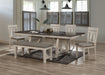 Form and function work beautifully together in the Maribelle dining group. The trestle base table features dual draw leaves that tuck away neatly and provide extra space when needed. The sturdy bench and chairs feature cushioned seats with gray linen weave upholstery. The two tone finish is on trend and fits into a variety of decor styles.