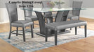 This sleek and modern dining group bridges form and function. The sculptural dining table has a sturdy base and the glass top allows views of the upholstered open shelf. Streamlined chairs and bench feature finished wood and upholstery for contrast.