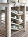 Made with Acacia veneers and select rubberwood solids, in a grayish white finish with rub through effect for a time worn appearance. Top is finished in a medium toned brown color with a planked effect with saw kerf distressing. Chair has a classic casual design with a tall ladder back look with simple features. Seat is covered in a light colored fabric cover. D394-32 pairs with 4 counter height stools. Built-in 8-bottle wine rack and open shelves. D394-024 cushioned saddle seat with a light textural polyester fabric. D394-113 barstool dimensions: 21"W x16"D x 24"H. D394-223 barstool dimensions: 16"W x 14" x 24"H. Multi functional dining table features two convenient side drawers and a storage bin on each end for maximum use of space. Storage on the ends for maximum use of space. Finished in a trend right gray washed color with contrasting light oak colored top. Solid wood chair frames with cushioned seat in light gray woven polyester fabric. Piano style bench with under seat storage bin. D394-423 counter height dining set includes 6 stools and counter height leg table. Two-tone finish with a brown wood tone top contrasted with a grayish white with rubbed through effects.