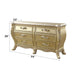 Indulge in the allure of this extraordinary Cabriole server and let its radiant presence transform your space. It is a testament to impeccable craftsmanship and timeless beauty, destined to be cherished and admired for years to come. Functionality is key, and the server is equipped with six spacious drawers. These drawers provide ample storage space for your dining essentials, such as cutlery, linens, and other items. The smooth-gliding drawers ensure easy access and convenient organization, adding practicality to the server's exquisite design. Adorning the server are beautifully crafted decorative scrolls, showcasing intricate detailing and adding a sense of artistry. To further elevate its design, the server features silver hand-brushed accent paint. This delicate touch of silver highlights the intricate patterns and details, creating a stunning contrast against the gold finish. The silver accents add depth and dimension, enhancing the server's visual appeal and creating a truly captivating piece. Whether placed in a dining room, living room, or hallway, this server will make a statement.