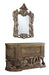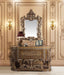 Ornate scrollwork and endless details the Constantine collection takes inspiration from the Baroque era to make up this dining set. The bronze finish creates a regal look to the set. The table sits on highly detailed wooden legs that are not only beautiful but sturdy. The chairs are visually striking on their own with ornate carvings and upholstered in bone PU that feature button tufted backrests.