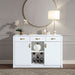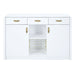 The white high gloss finish of the Paxley server creates a sleek and polished appearance that adds a touch of modern elegance to any room. The glossy surface not only enhances the server's visual appeal but also makes it easy to clean and maintain. The three drawers offer convenient storage for your dining essentials, such as cutlery, napkins, or small serving utensils. The drawers provide a clutter-free solution, keeping your dining area organized and tidy. The wine rack is a standout feature of this server, offering a dedicated space to store and display your favorite bottles of wine. It allows you to keep your wine collection within reach, ready to be enjoyed during meals or special occasions. The two cabinet spaces provide additional storage options for larger items, such as serving platters, table linens, or dinnerware. These cabinets offer concealed storage, allowing you to keep your dining area neat and organized. An open shelf is included, providing a versatile space for displaying decorative items or storing frequently used dining accessories. It offers a perfect opportunity to showcase your style and add a touch of personality to the server.