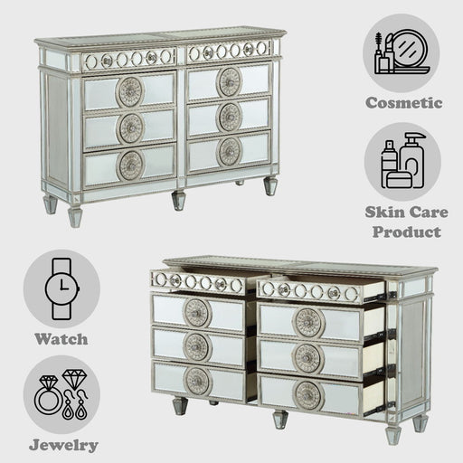 ACMEVarian II - Dresser - Mirrored, Black & SliverProduct Features 8 Drawer Mirrored Top, Raised Geometric Trim, Sunburst Motifs Drawer: Glide Side...