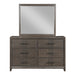 The Landon Dresser Mirror in Brown offers a perfect blend of durability, style, and functionality, making it a refined addition to any bedroom. Expertly crafted from solid Pine, high-quality engineered woods, and genuine Mindi wood veneers, this mirror is built to last while preserving the natural beauty of wood with its multi-step walnut finish and subtle gray undertones. The mirror's sleek design features picture frame moldings that elegantly encase crystal-clear, low-distortion beveled glass, ensuring a flawless reflection. This piece not only enhances the aesthetic appeal of your space but also provides impeccable functionality, adding a touch of sophistication to any room.