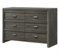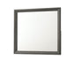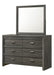 This bedroom collection encapsulates a blend of contemporary design and rustic charm. The centerpiece, a bed with a distinguished chevron patterned headboard, evokes a sense of craftsmanship and texture, infusing the space with character. Flanking the bed are matching pieces, each exhibiting clean lines and a finish that suggests a lived-in elegance. The dresser, complemented by a substantial mirror, along with the tall chest, offer ample storage solutions with understated metal handles that enhance the modern farmhouse aesthetic. A nightstand completes the set, its compact design making it a practical addition to the suite.