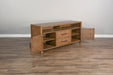 The transitional style of this entertainment console will complement both traditional and modern designed living rooms. This beautiful taupe buckskin finish console features cabinets, drawers, and open space for all your storage needs.