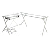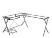 Corner Computer Desk Orientation: "L" ShapeX-Shape Metal Frame BaseRectangular Table Top w/Tempered GlassKey Board Tray IncludedComputer Holder Included