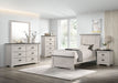 This bedroom set embodies a breezy, transitional style that harmonizes with any decor. The gracefully designed bed, with its panel headboard and soothing finish, invites a sense of calm and simplicity. Complementing the bed are the dresser and mirror, tall chest, and nightstand, each exhibiting a clean-lined structure and finished in a gentle hue that mimics the soft touch of morning fog. Classic hardware accents provide an understated elegance, while ample storage space in each piece ensures practicality meets sophistication.