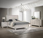 This elegant bedroom collection presents a sophisticated ensemble perfect for creating a refined modern aesthetic in your sleeping quarters. The suite features a sleek, minimalist design with crisp, clean lines and a rich finish that exudes contemporary charm. Anchoring the set is a robust panel bed with a prominent headboard, promising a sturdy and stylish centerpiece. Flanking the bed are complementary case pieces, offering ample storage with their smooth-gliding drawers accented with chic silver-toned hardware.
