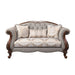 A new addition to Acme's collection of exclusive designs, the Miyeon loveseat in cherry finish is full of handsome details. Nailhead trim along the padded seat base runs up the scrolled arms and arched seatbacks. Button tufting on the seatback makes the fabric upholstery look especially cozy. Raised floral motifs embellish the Queen Anne legs of the piece.