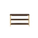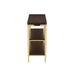 - KD, Rectangular Leg Sofa Table Storage: 2 Open Compartments (2 Wooden Shelves) CONSTRUCTION Wooden Top & Shelves: Wood Veneer, Pine Wood Metal Tapered Leg & Trim: Gold finish NO Drawers