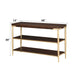 Entertain in style with the Eschenbach Sofa Table. This classic rectangular occasional table features a cherry finished table top with a metal base. This distinctive metal and wood cocktail table feature unique tapered legs with two open wood shelf for storage and display. This stylish accent table has a captivating look that makes it an eye-catching piece in any room. Use it to add a touch of contemporary flair to a traditional space or to simply complete a modern aesthetic.