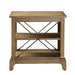 Enhance your home decor with this Hiroko end table. This beautiful table features a unique light oak finish with metal X-shape design and shaped feet. The extra shelves on this end table would also make a great place to display collectibles and other decorative accents.