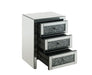 The Noralie Accent Table will give any room a touch of glamour. Mirror and glass materials give it a modern and clear touch while faux diamond inlays add glam style to this piece. Use this unique piece as the perfect accent for any room decor. It has three storage drawers with self closure and safety stop, providing ample and convenient storage for small electronics, cosmetics, accent items, jewelry, and more.
