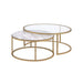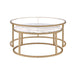 Entertain in style with the Shanish Coffee Table Set. This distinctive two-piece occasional table set showcases intertwining tables with a gold finished metal base that nestles together or can separate for additional entertainment and display space. This unique round coffee table set features one large table with glass top and a smaller table with faux marble top and is a must-have accent piece for your home. Use it to add a touch of contemporary flair to a traditional space or to simply complete a modern aesthetic.