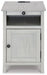Add big character to a small space with this chairside end table. With its compact size and strong silhouette, it can go anywhere and blend easily into the decor. Less is so much more with the Shaker-inspired design and whitewashed wood grain finish. Loaded with form and function, this end table displays accent pieces and stores essentials securely while keeping devices powered up.
