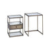 Create double the end table space with the contemporary Enca two-piece nesting tables. This trendy antique brass with clear glass set can be used next to each other in a stepped pattern to produce a beautiful showcase or used separately in different areas of the room. When you don't need both, slide the smaller table under the larger and it's out of the was until you need it for your next gathering. These light weight tables are easy to move around, perfect for entertaining and easy to use for redecorating. The smaller table has a small drawer for movable storage. Some Assembly Required.