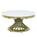 Explore the design power of mixed motifs in a round coffee table that promises to lift the ambiance in a modern space. This coffee table is constructed of lush gold finish stainless steel in a ring apron and twisted open rod cinched pedestal. Gold stainless steel configures an unusually shaped base with well-placed diminutive feet to protect flooring. Attention turns to an accessible, artificial marble top with a brilliant white finish, perfect for adding bright beauty to a living room or family room.
