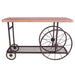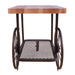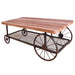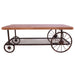 Get on board with the industrial style movement with the Francie occasional tables, it confirms you are hip by having this fun table in your living room. This table features a butcher block top and metal mesh lower shelf supported by wheels in the form of a cart.