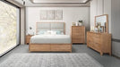 This contemporary bedroom group brings a sense of warmth and modern elegance to any space with its clean lines and natural wood tones. The upholstered panel headboard adds a soft, inviting touch, while the platform bed offers integrated footboard storage for added functionality. Sleek metal drawer pulls complement the streamlined silhouettes of the matching nightstand, dresser, and chest, enhancing the set’s minimalist appeal. Finished in a light wood grain, the ensemble exudes a relaxed sophistication, perfect for creating a bright and calming retreat.