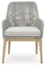 This dining arm chair invites your casual contemporary style outdoors. With its resin wicker in a chic neutral hue, it expertly marries refined design with durability. Breezy summer mornings and cold winter nights are made all the more comfortable with high-performance Nuvella+ fabric covering the seat cushion.