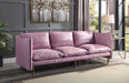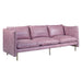 The Metis sofa is upholstered in buttery SOFT top grain leather in a Wisteria color that adds a touch of effortless romance to any room. The luxurious sofa is equipped with ultra-plush cushions and backrests. The metal brass legs add a hint of modern industrialism to the simplistic design. The inner wooden frame makes for a durable piece.