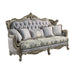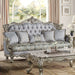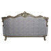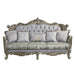 Oozing with elegance and refinement, the Miliani sofa makes for an alluring living space. With beautiful scroll legs and shell carvings throughout the trim for a classic touch. The button tufting not only adds a decorative element to the piece but also serves a functional purpose. It helps to secure the padding or cushioning underneath, preventing it from shifting or sagging over time. The nailhead trim accentuates the beauty of any piece of this piece. The two-tone fabrics and bronze finish modernize the traditional style of this sofa and gives it an edge. Five throw pillows are included.