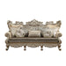 - Oversized Scrolled Carving Trim with Nailhead Trim: Detailed Accents Inside/Outside Backrest: Champagne Finish, Poplar Wood (Front Armrest, Leg & Base)